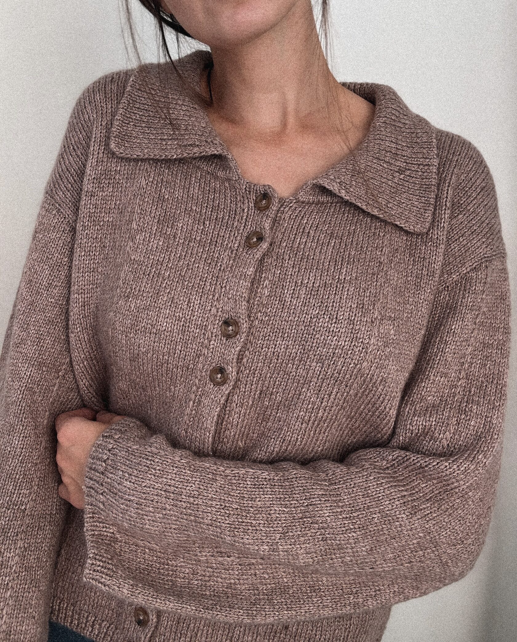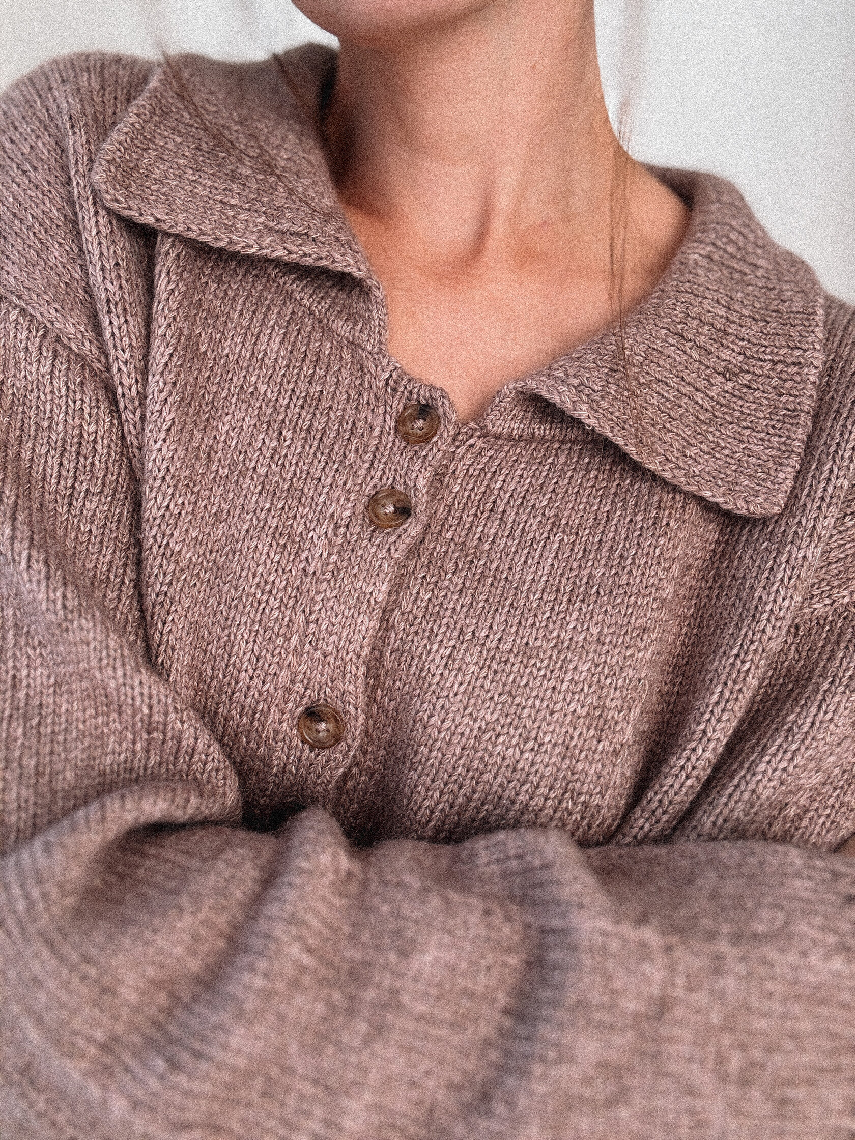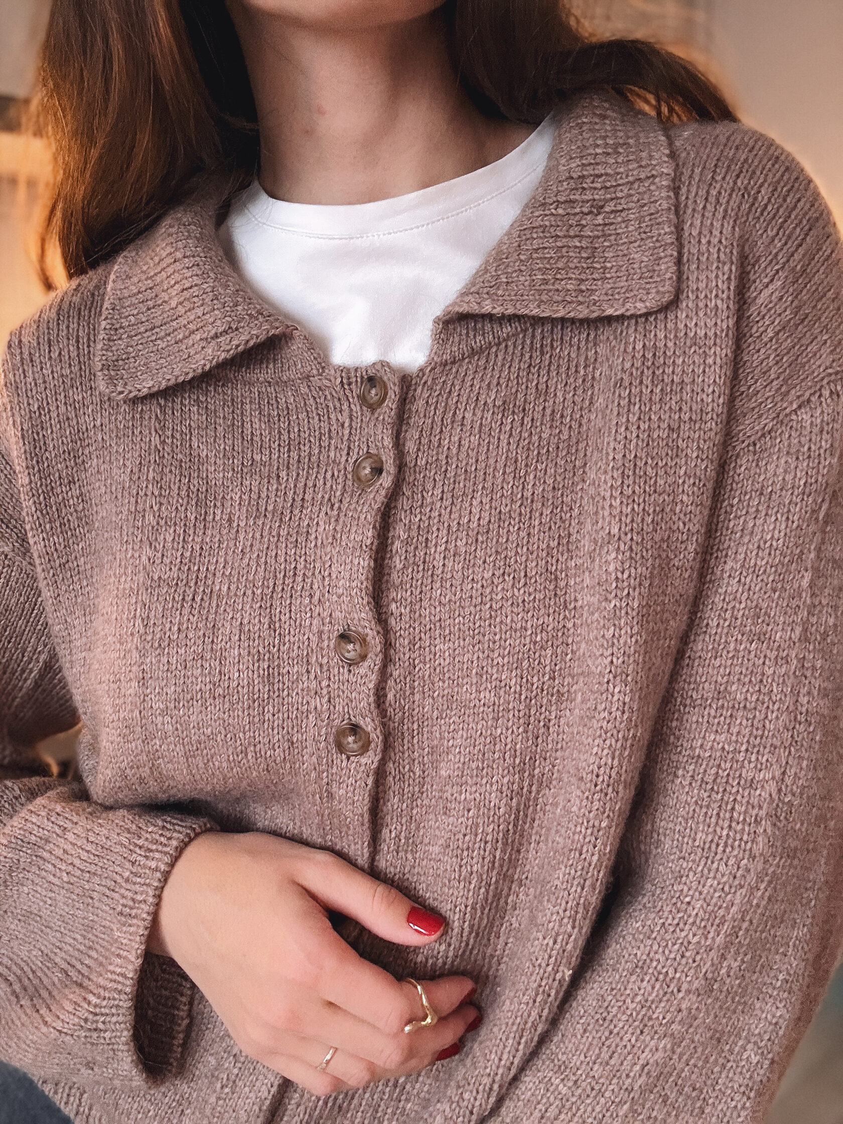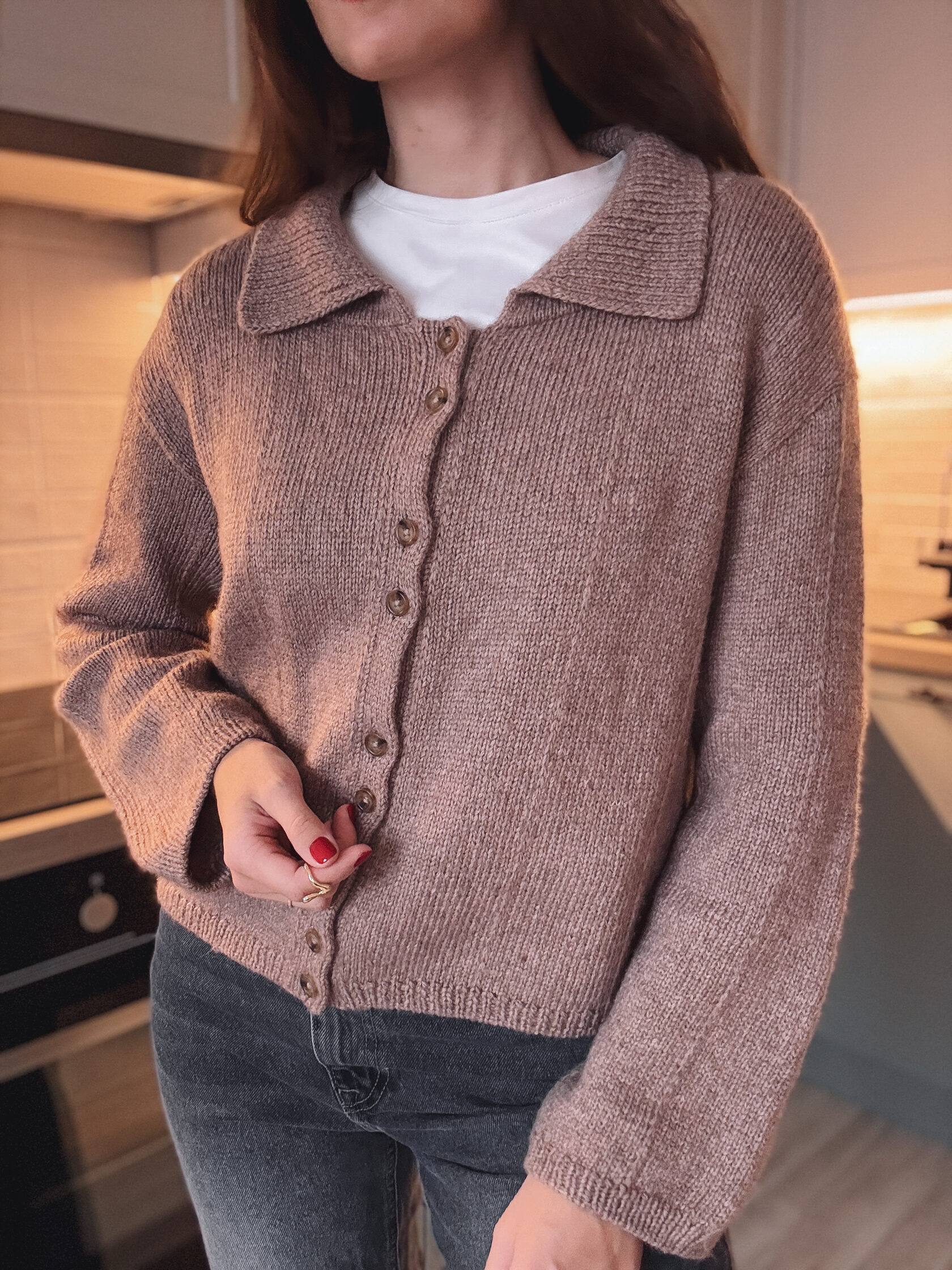 #polo_line_jacket имеет умеренный оверсайз, вяжется сверху-вниз, поворотными рядами, c узором «косичка»