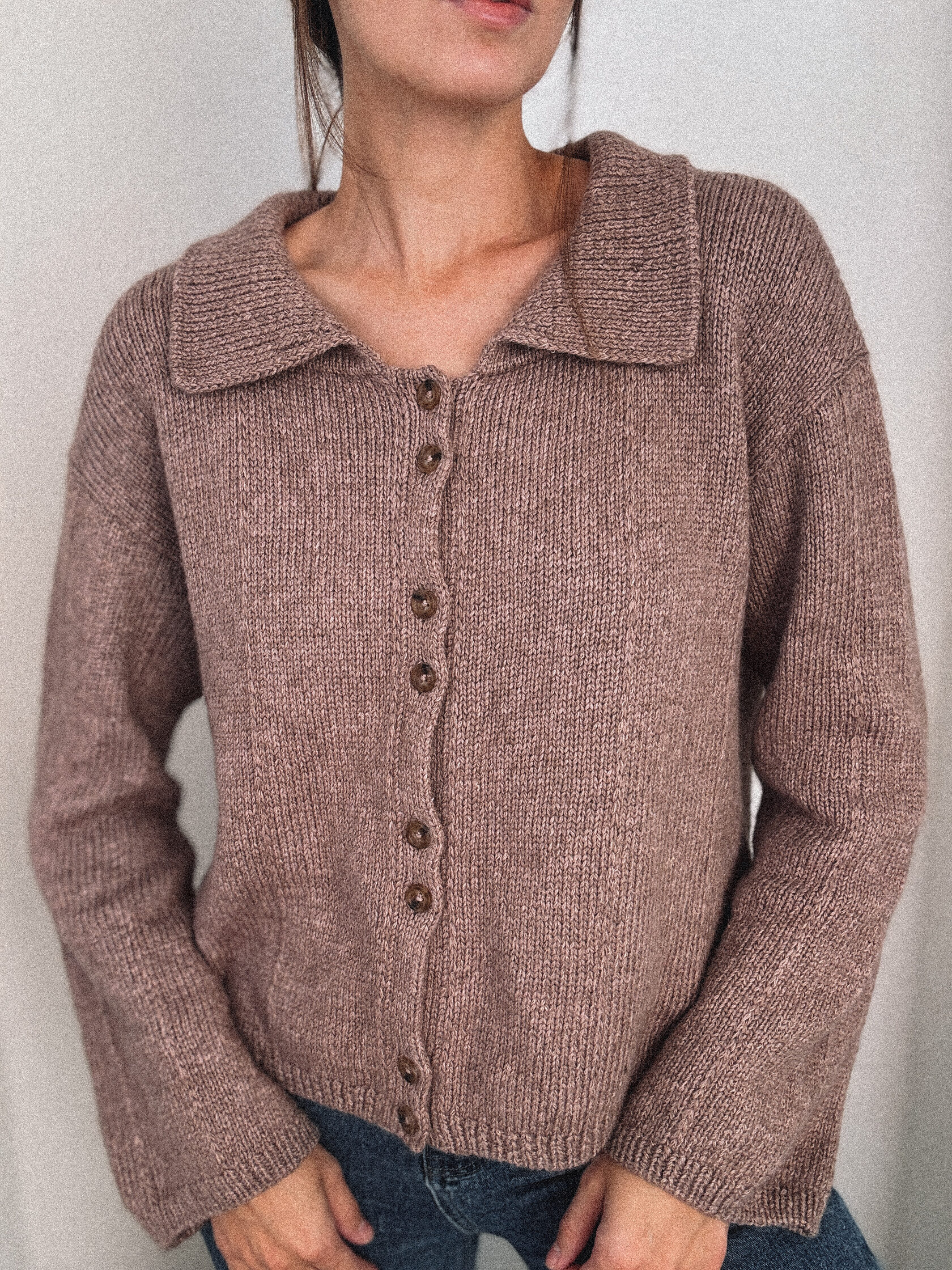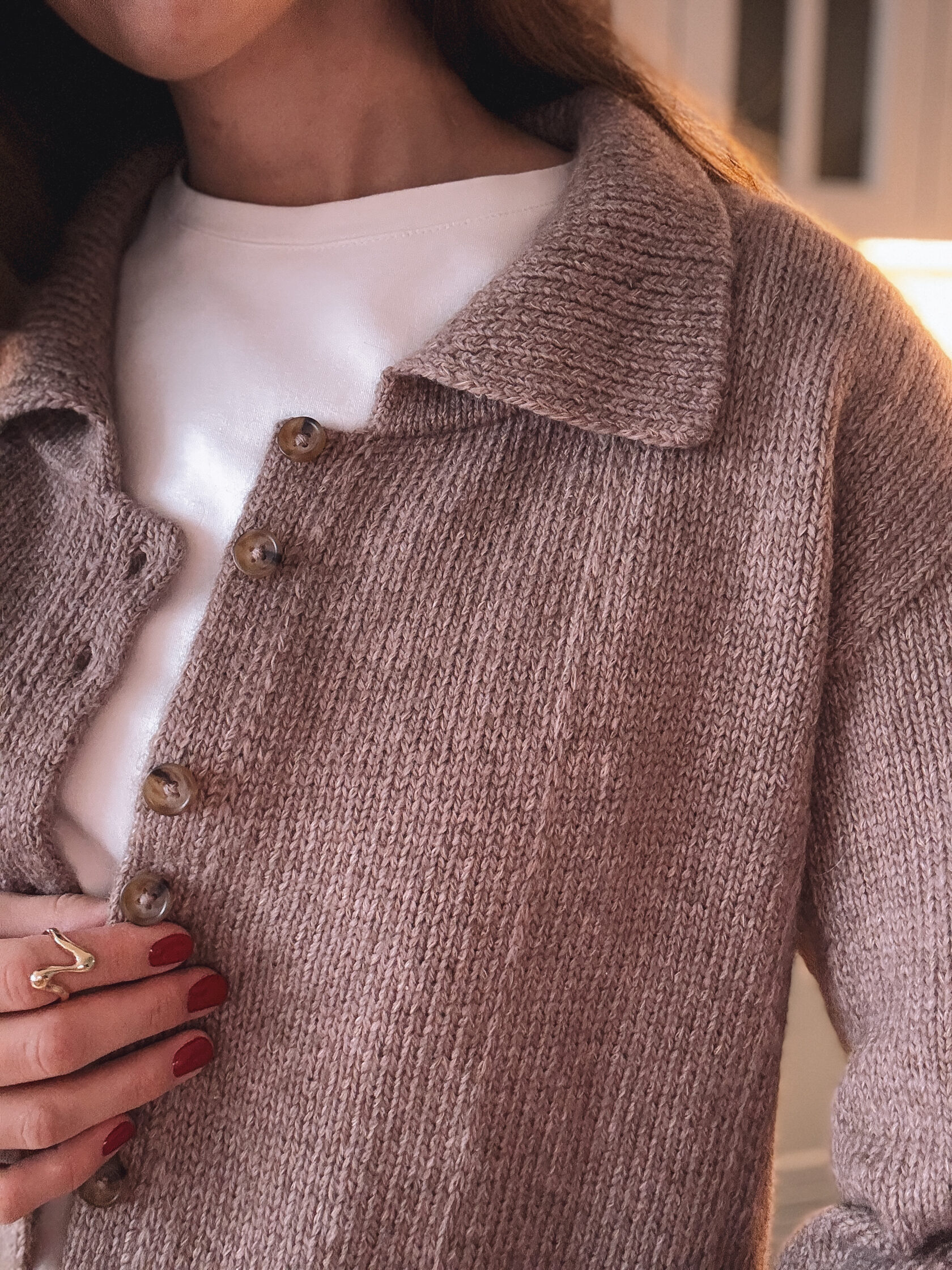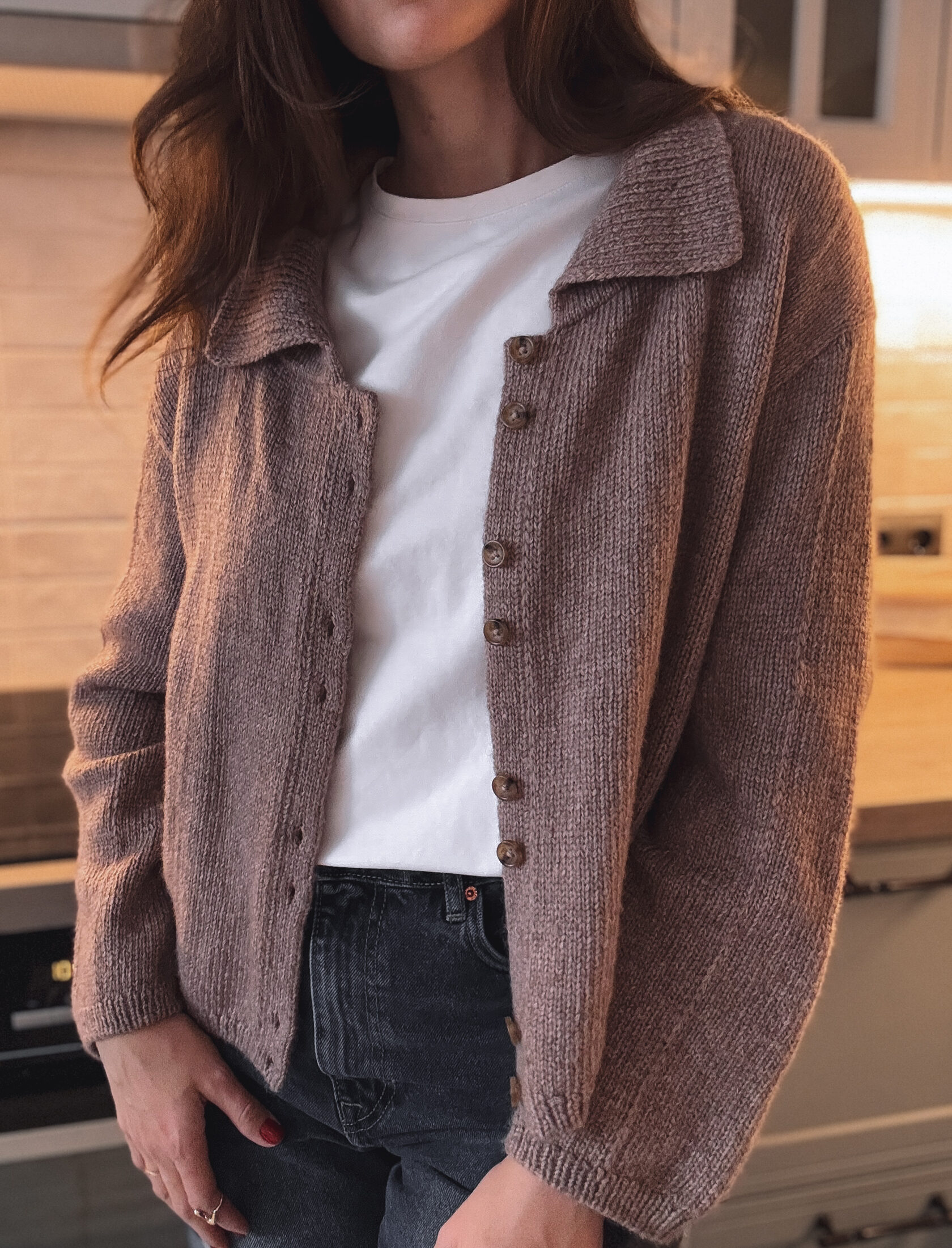 #polo_line_jacket имеет умеренный оверсайз, вяжется сверху-вниз, поворотными рядами, c узором «косичка»