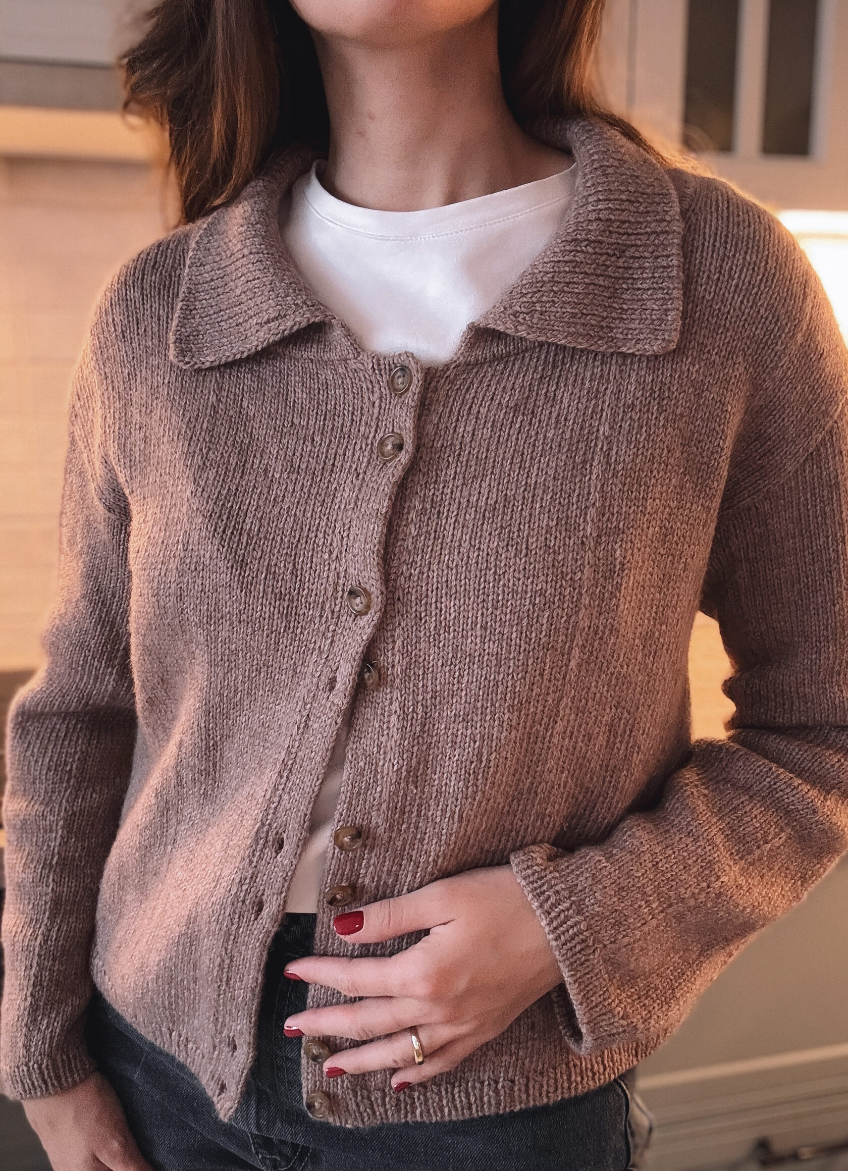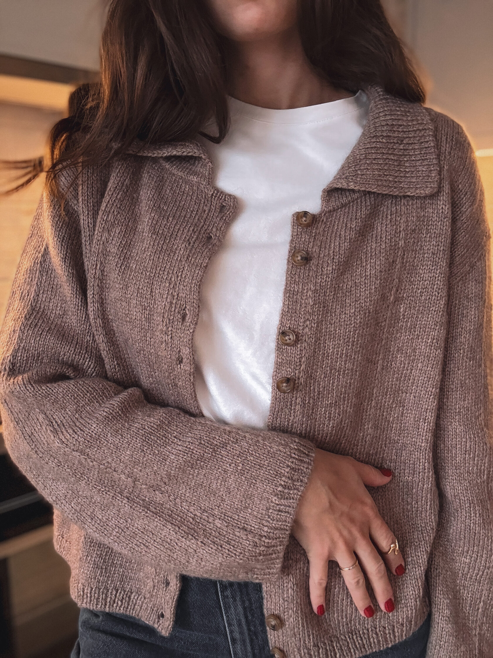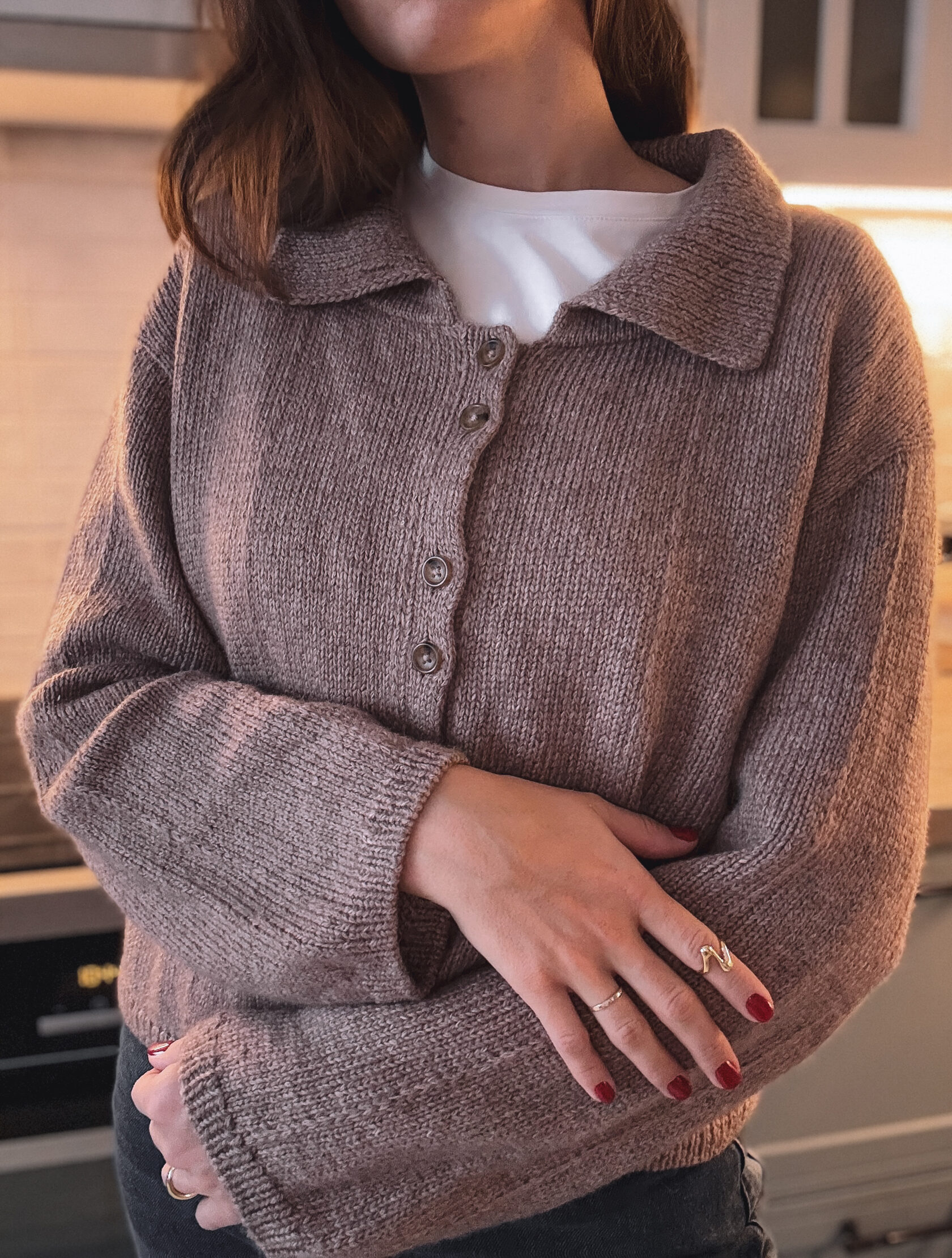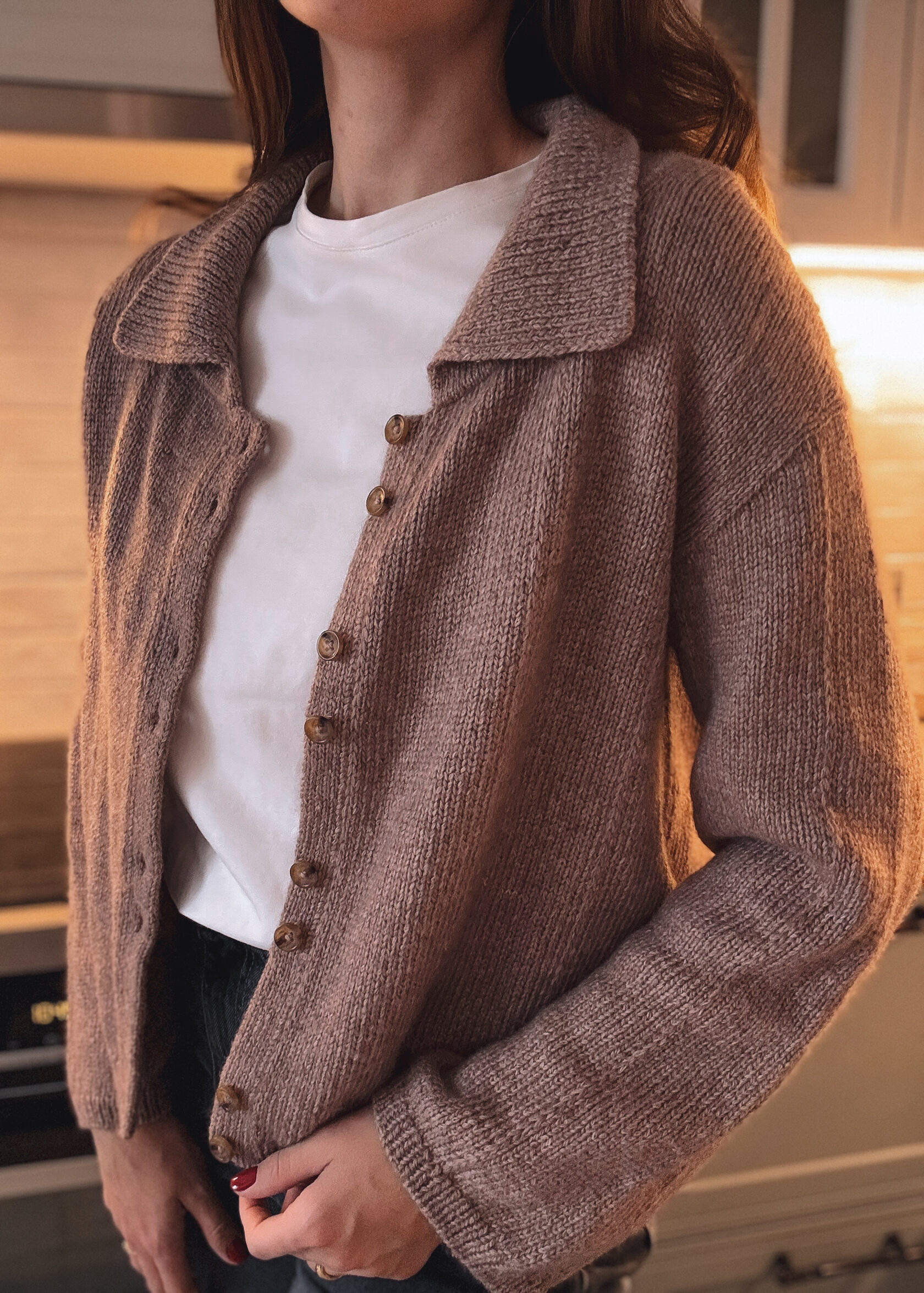 #polo_line_jacket имеет умеренный оверсайз, вяжется сверху-вниз, поворотными рядами, c узором «косичка»