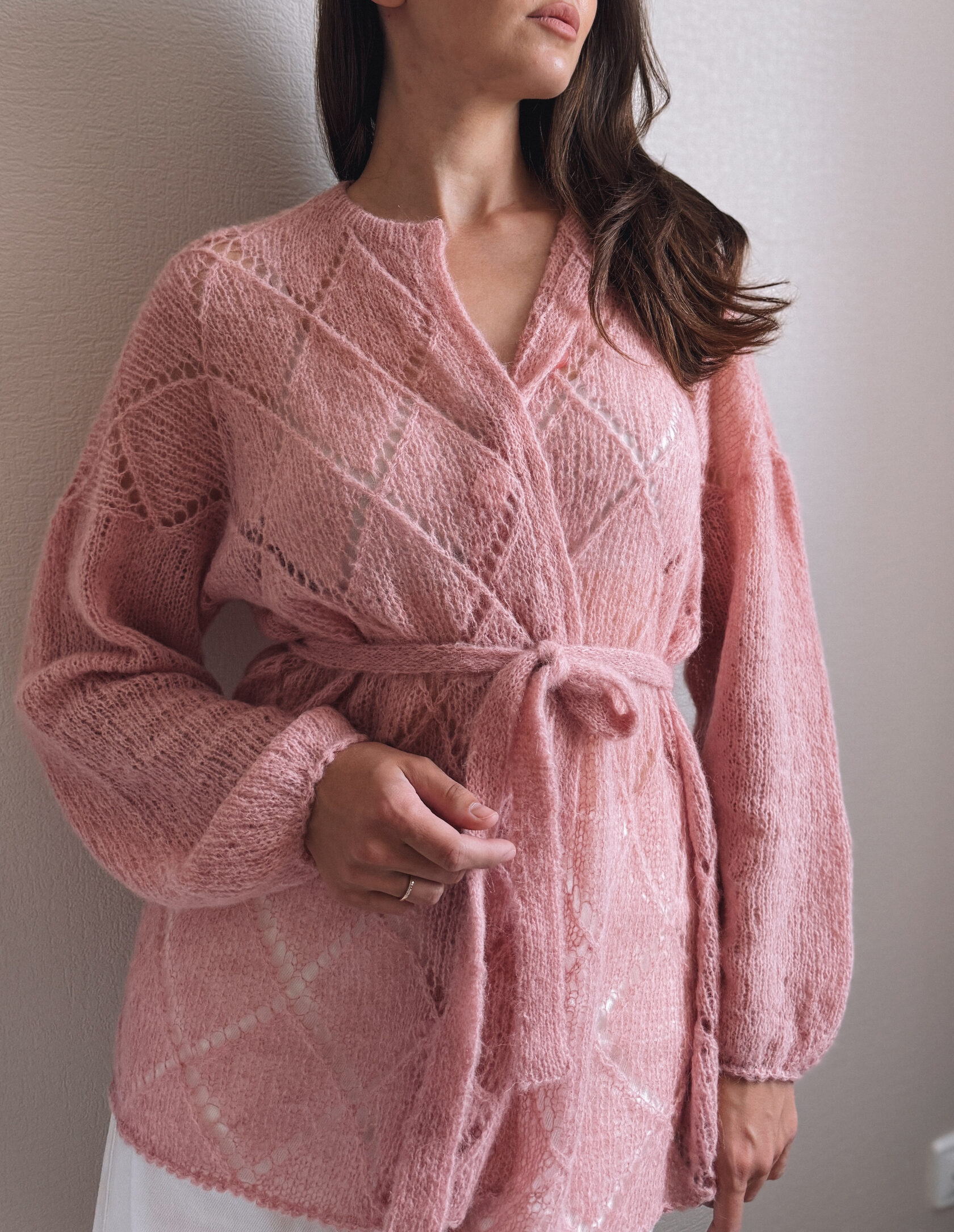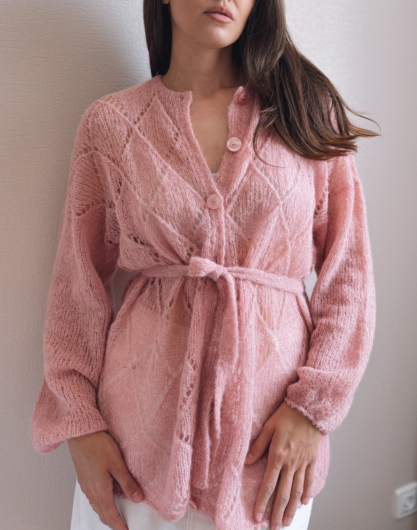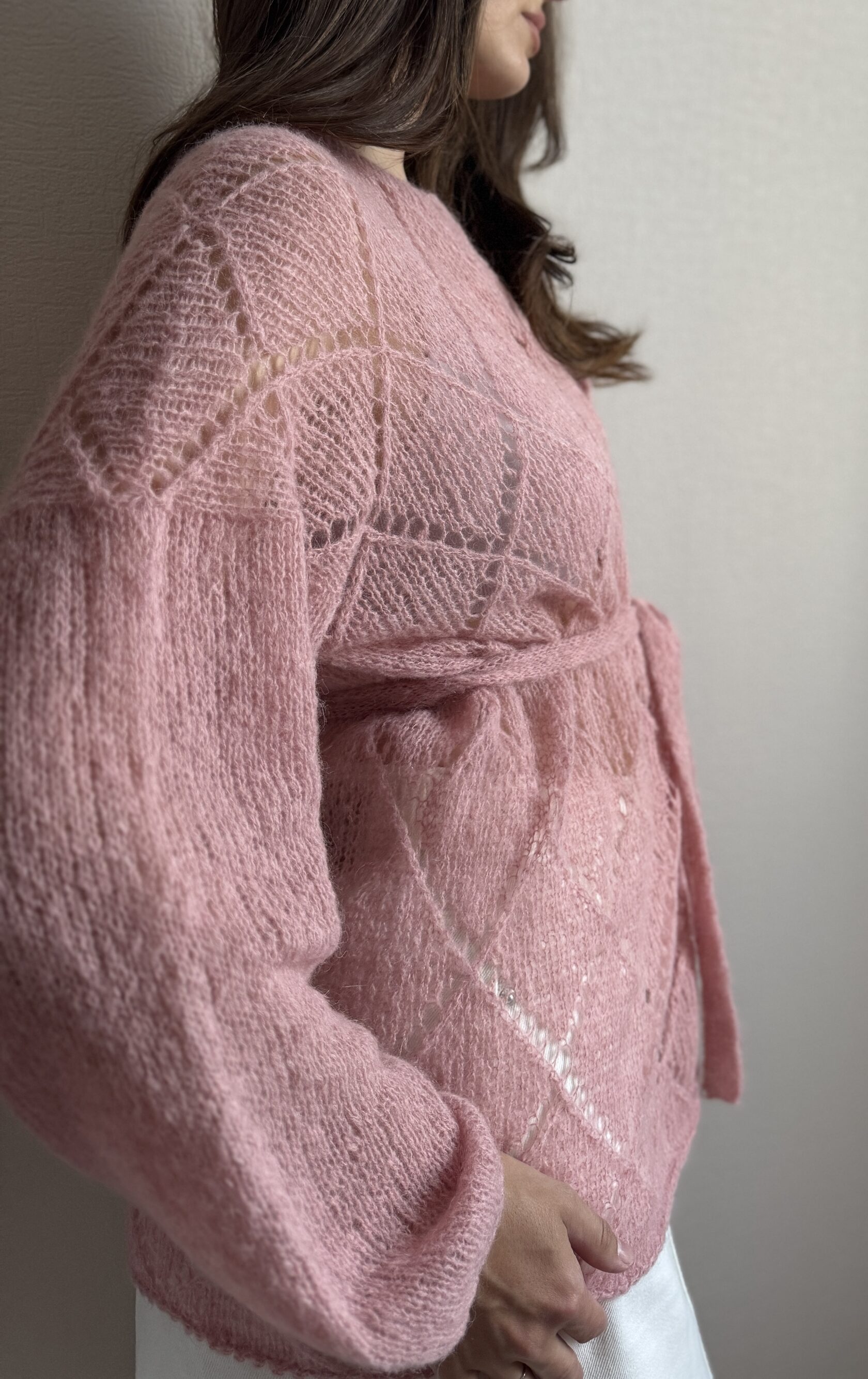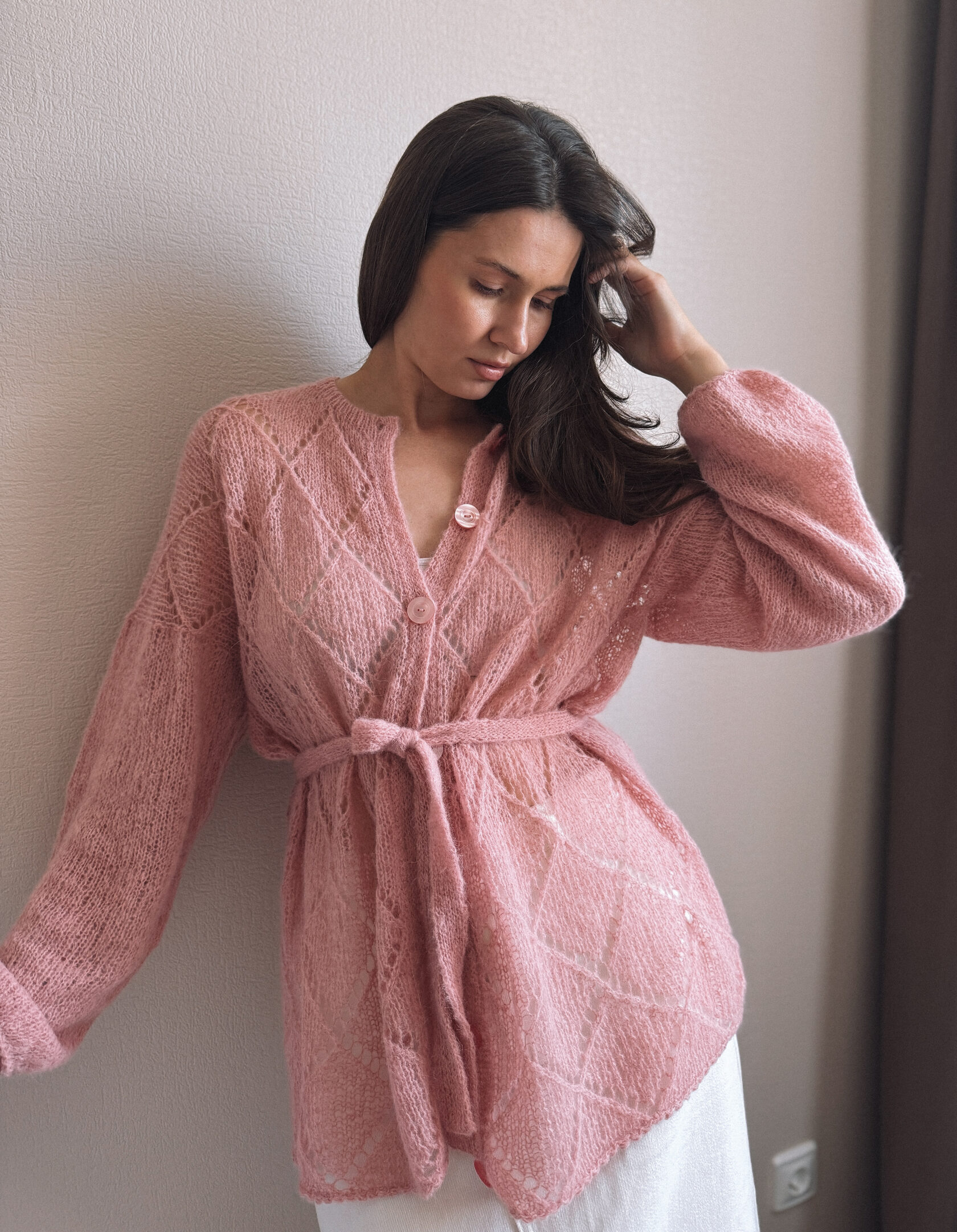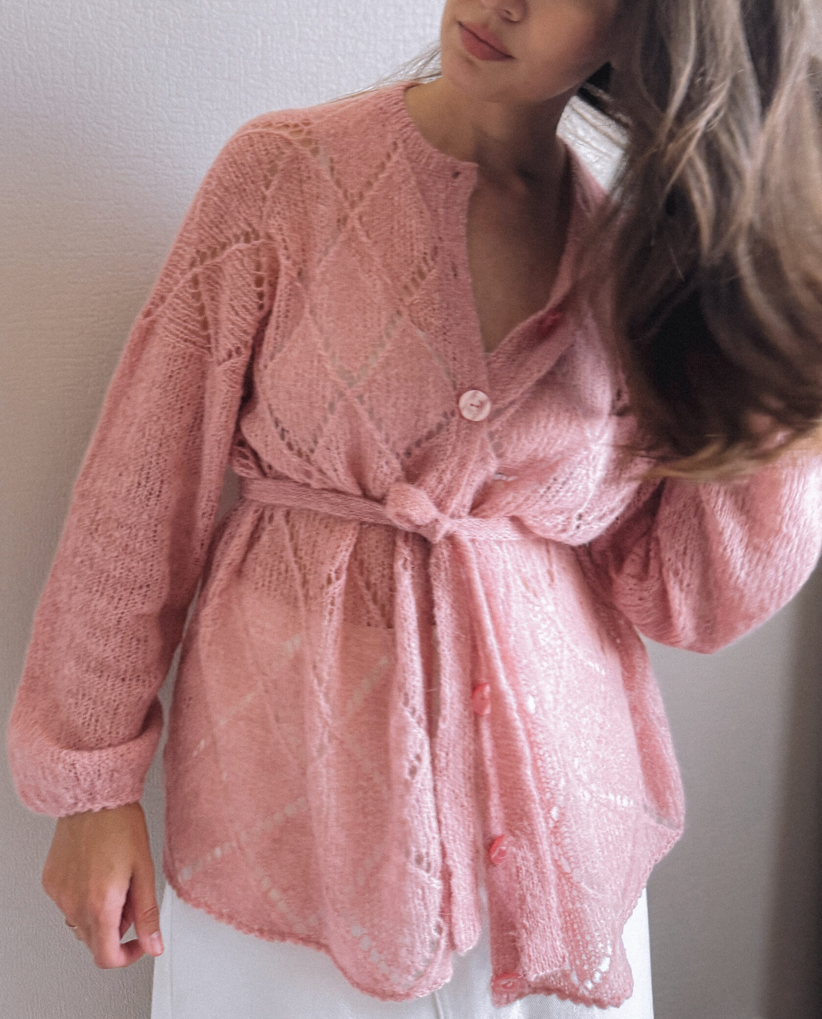 Кардиган вяжется снизу-вверх поворотными рядами. Тело кардигана связано узором«ажурный ромб», рукава - лицевой гладью. По краю низа изделия и рукавов идет обвязка крючком. Планки вдоль полочек и горловины связаны полой резинкой.