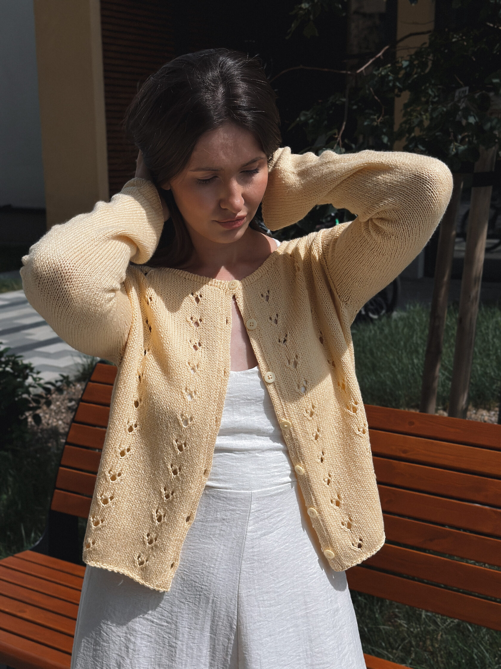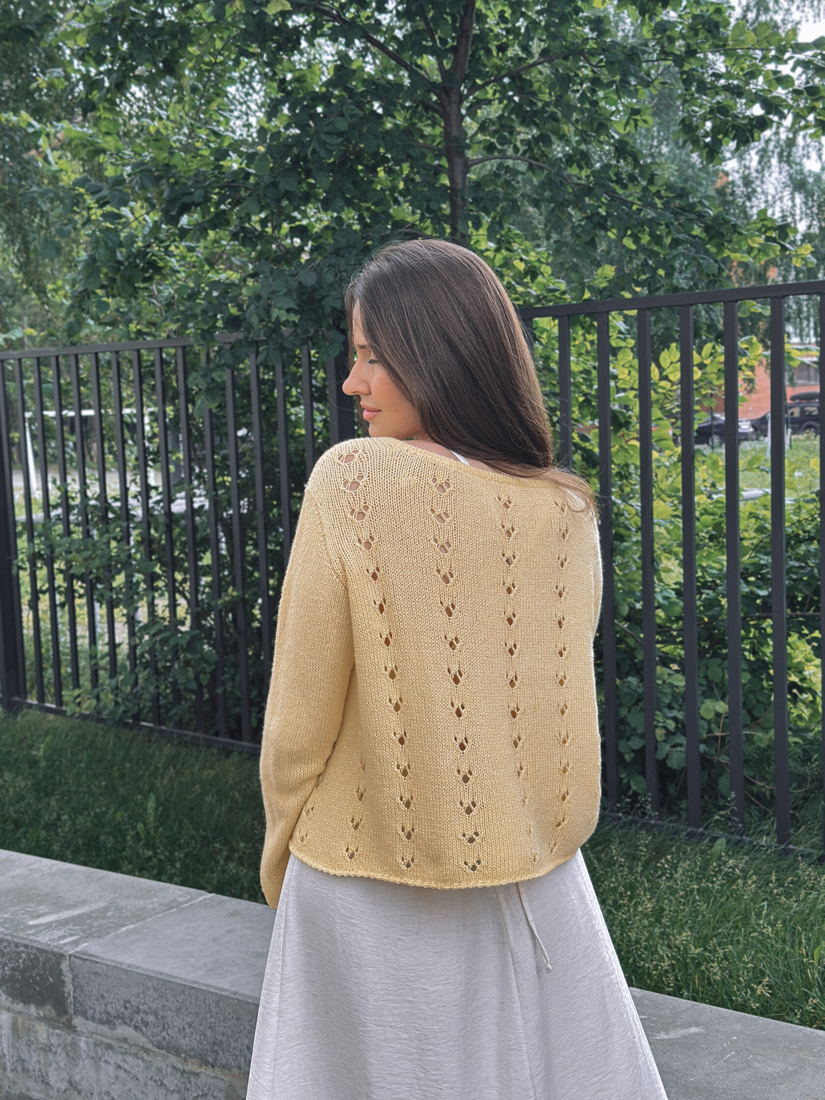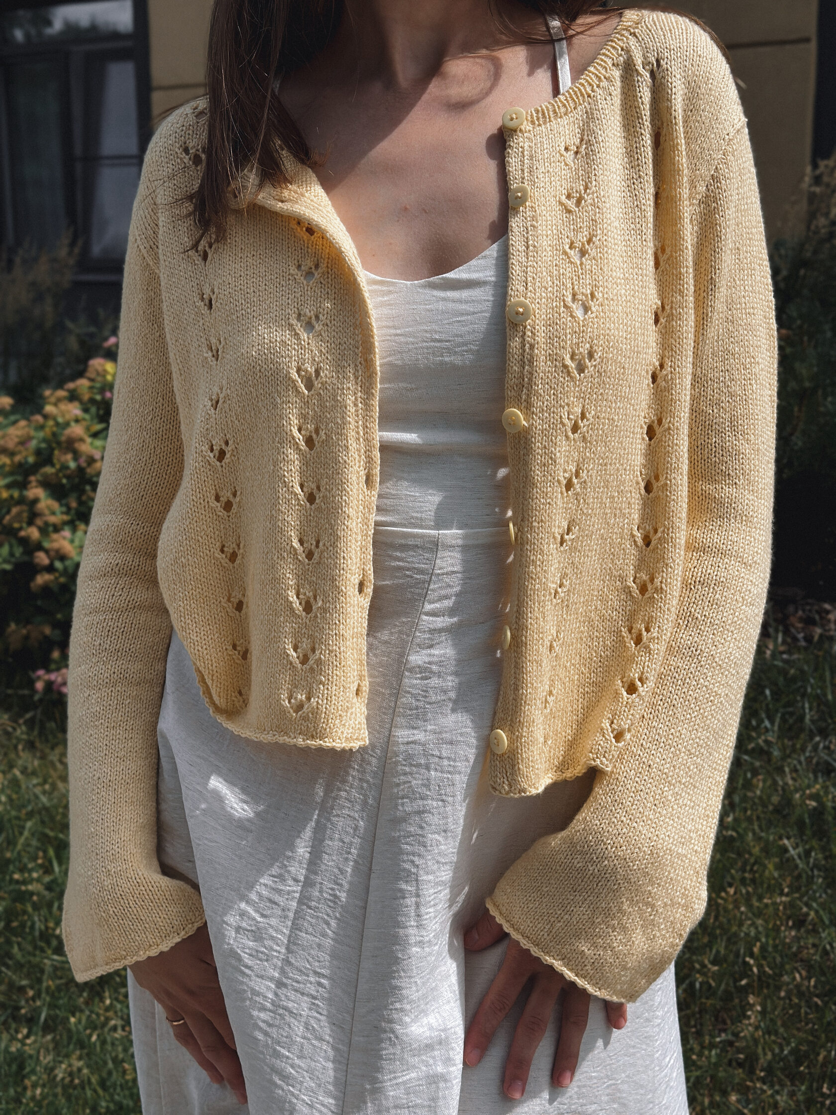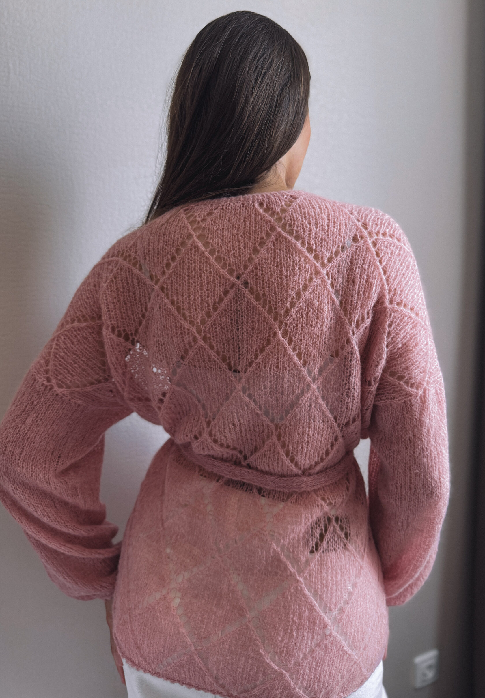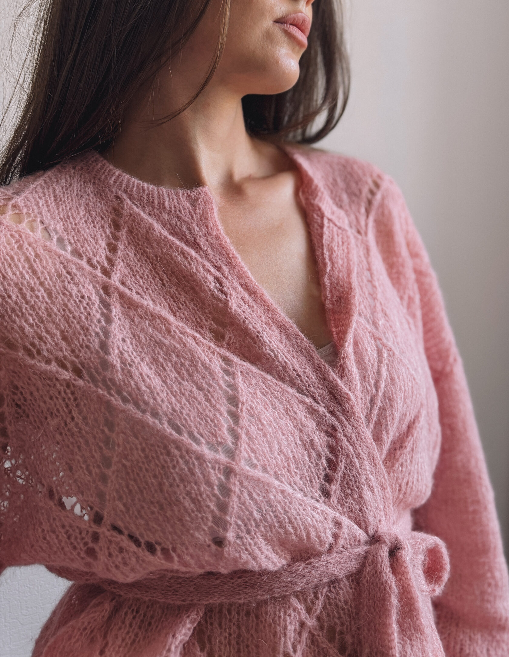 Кардиган вяжется снизу-вверх поворотными рядами. Тело кардигана связано узором«ажурный ромб», рукава - лицевой гладью. По краю низа изделия и рукавов идет обвязка крючком. Планки вдоль полочек и горловины связаны полой резинкой.