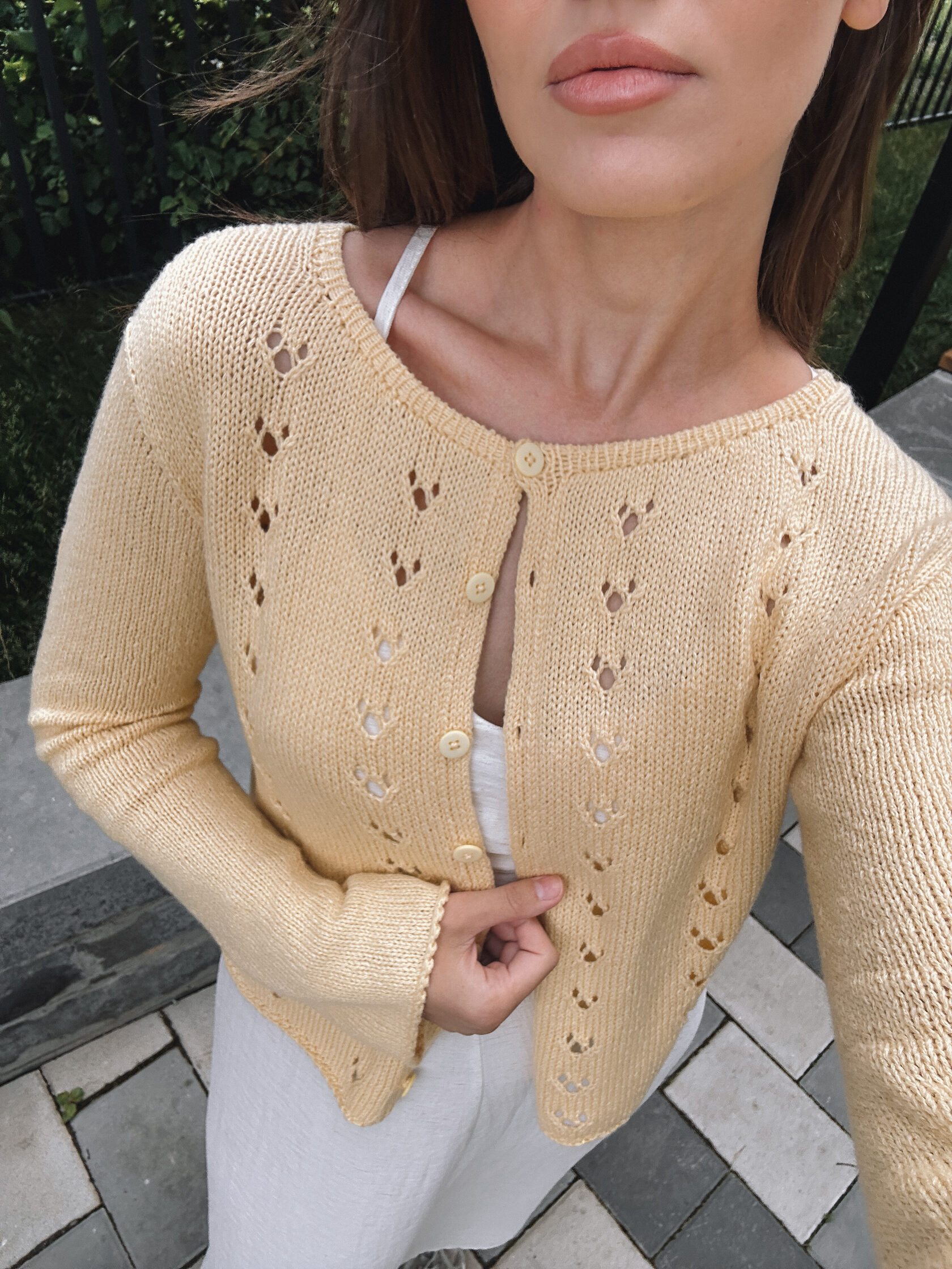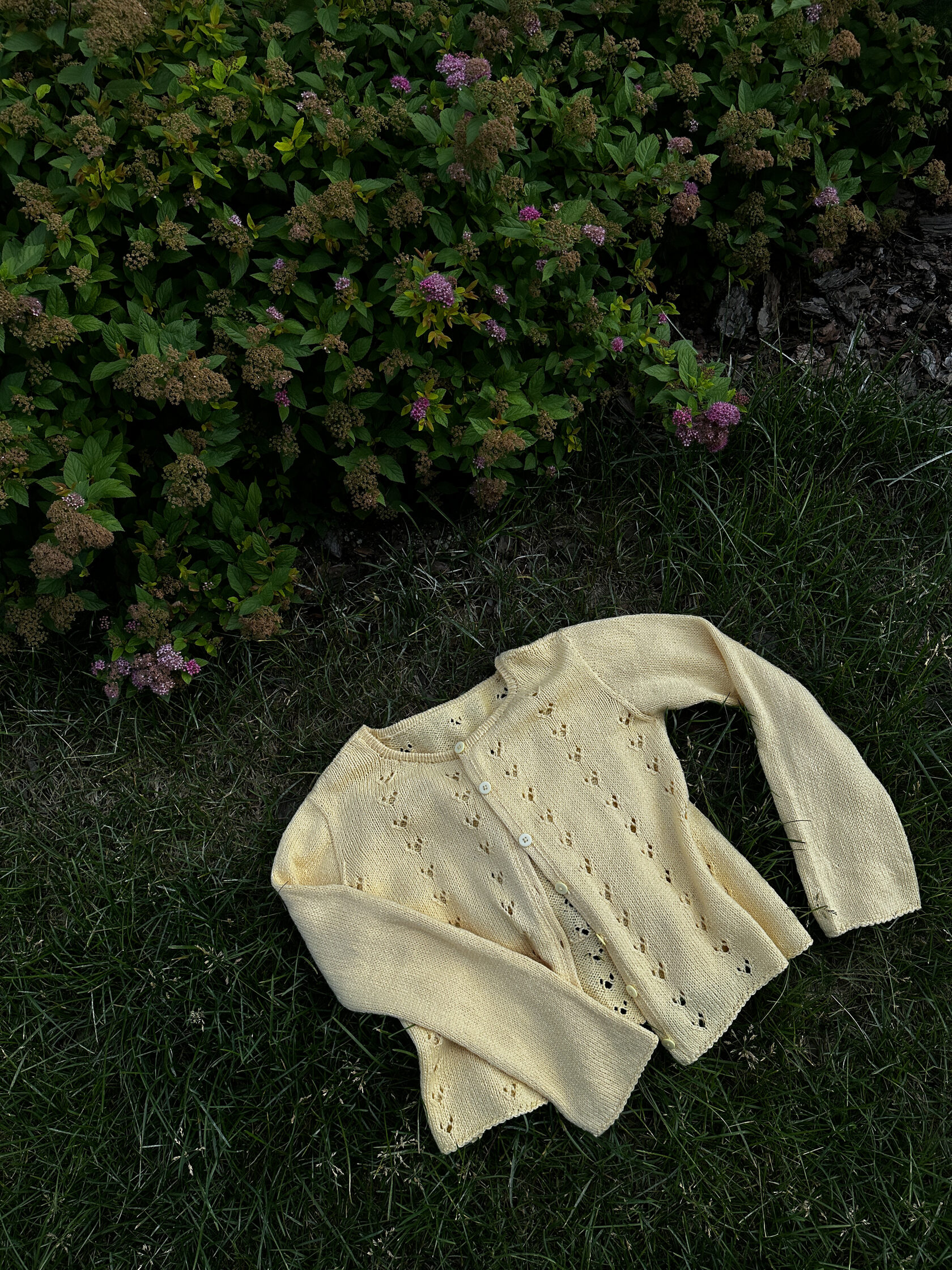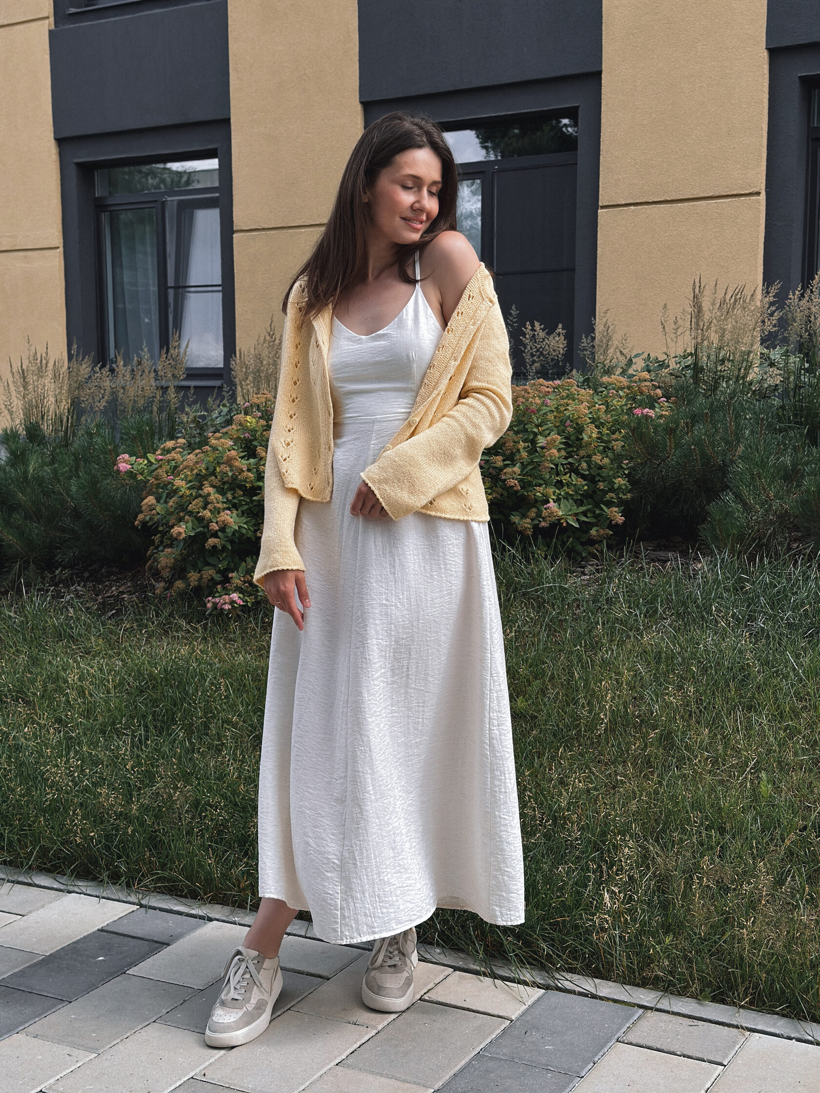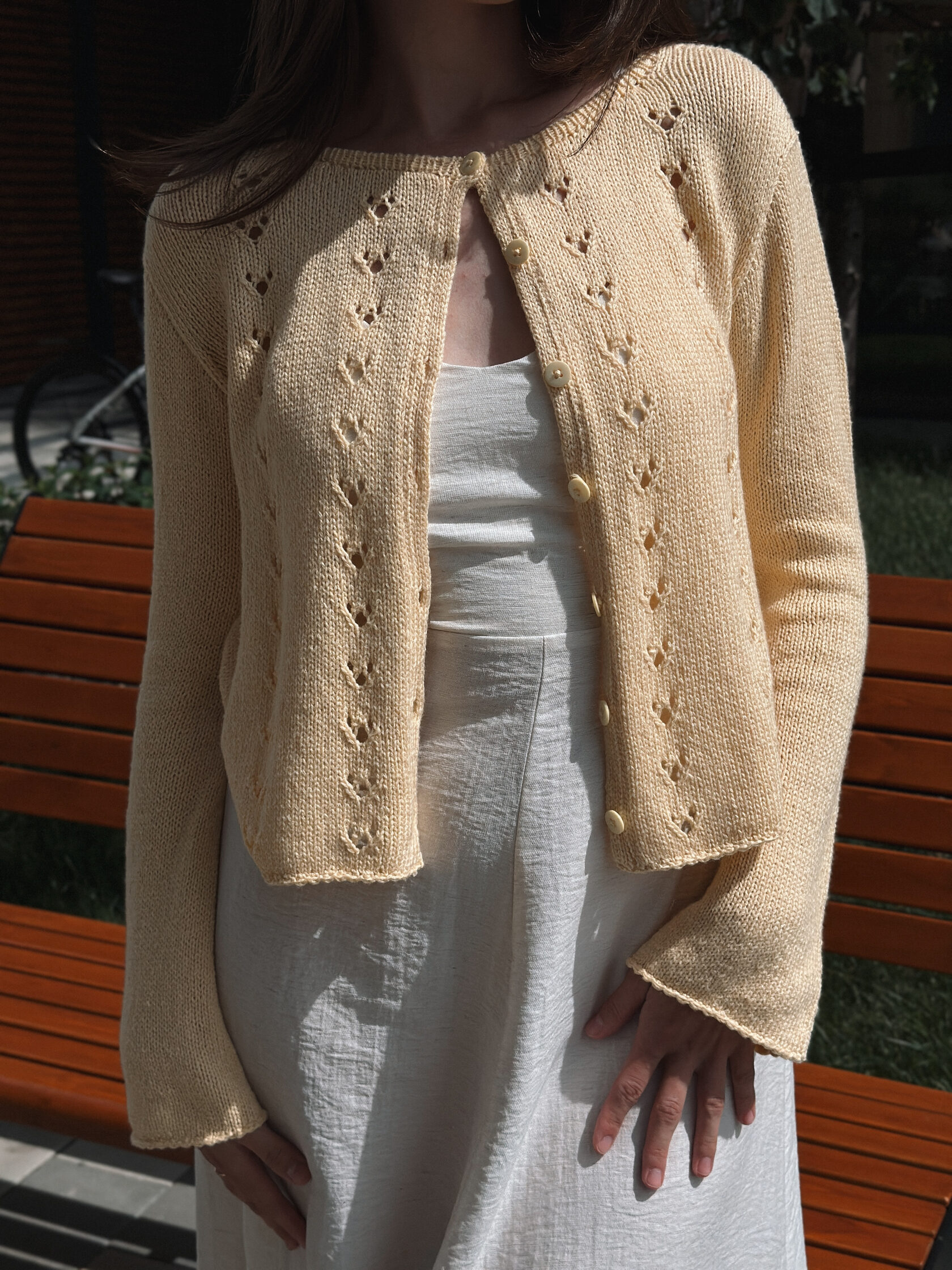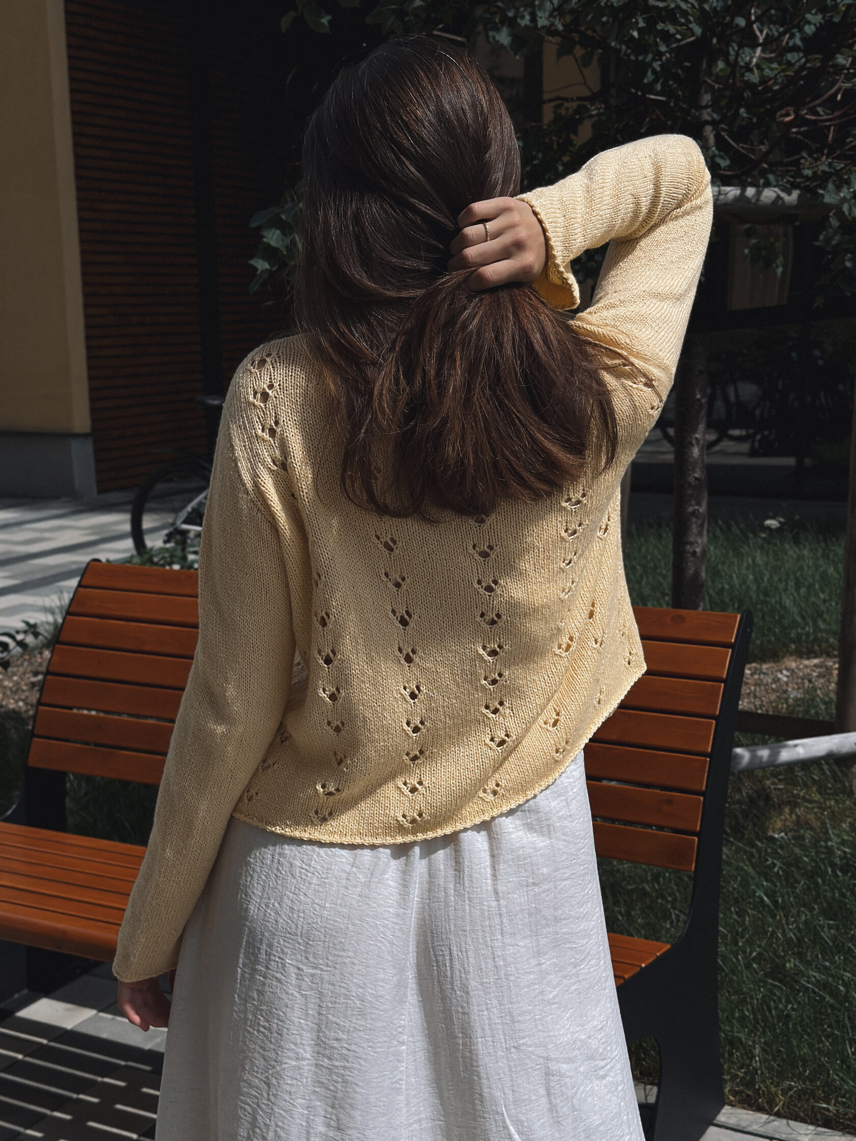 Кардиган вяжется снизу-вверх поворотными рядами. Тело кардигана связано узором«ажурный ромб», рукава - лицевой гладью. По краю низа изделия и рукавов идет обвязка крючком. Планки вдоль полочек и горловины связаны полой резинкой.